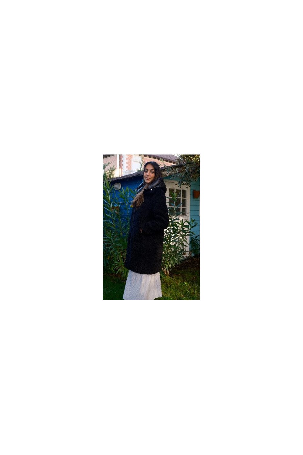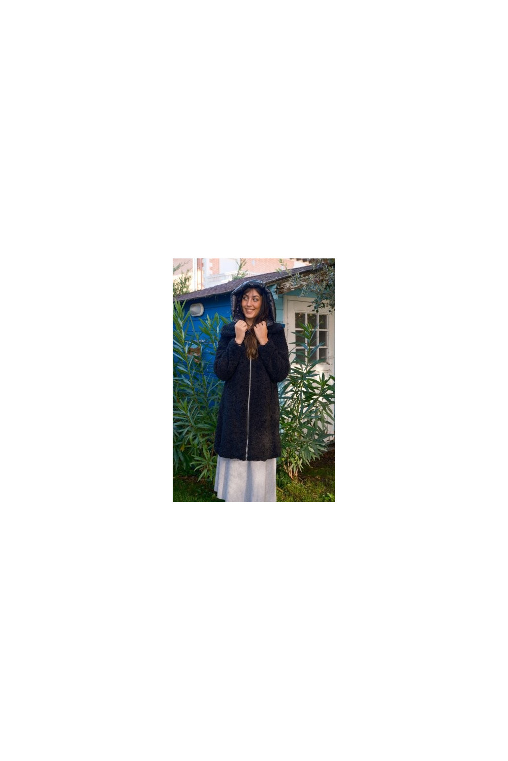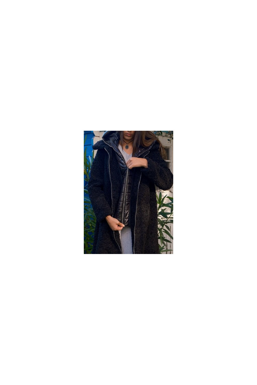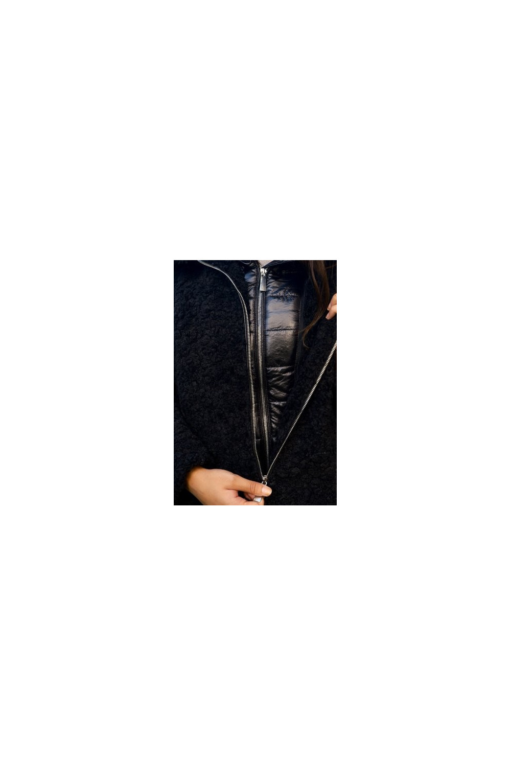 Abrigo pelo sintético negro con cierre exterior con cremallera.