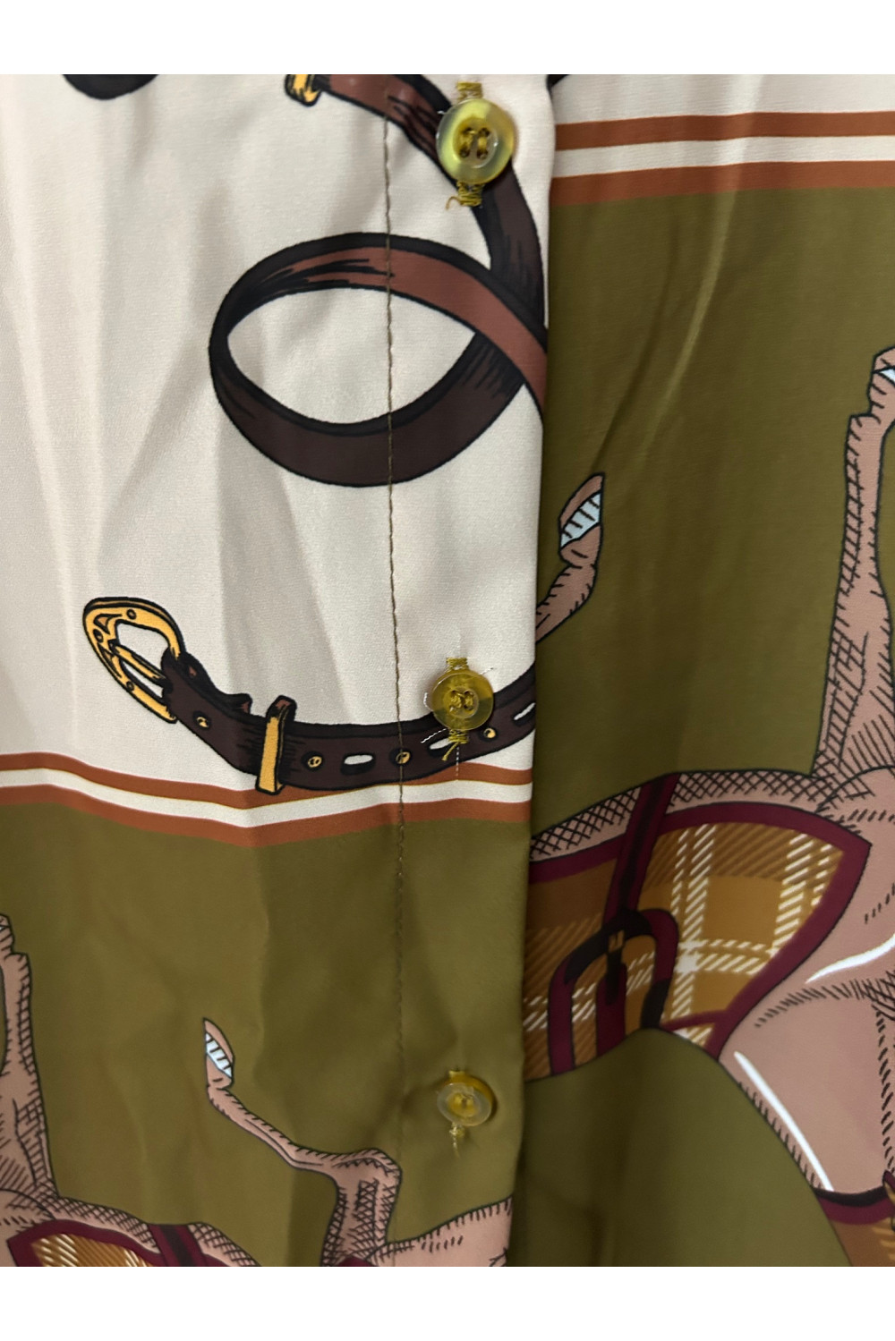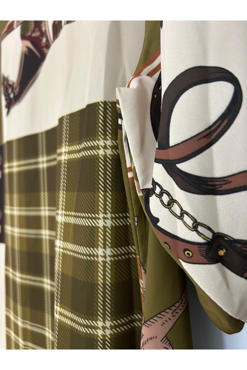 Vestido camisero en tonos verdes y beige con motivos de caballos. Talla única.