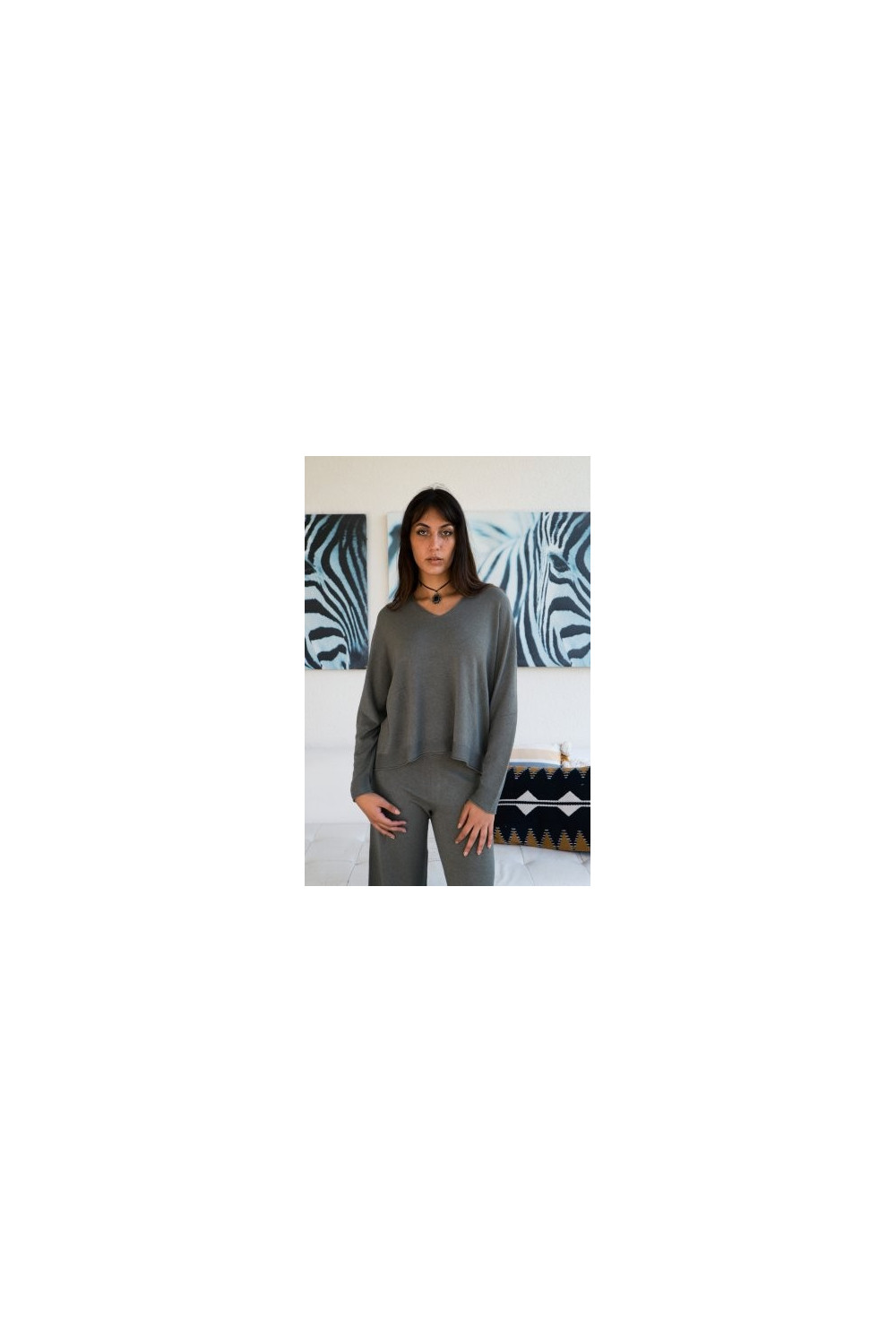 Jersey cuello pico en punto liso fino, color gris. Talla única.