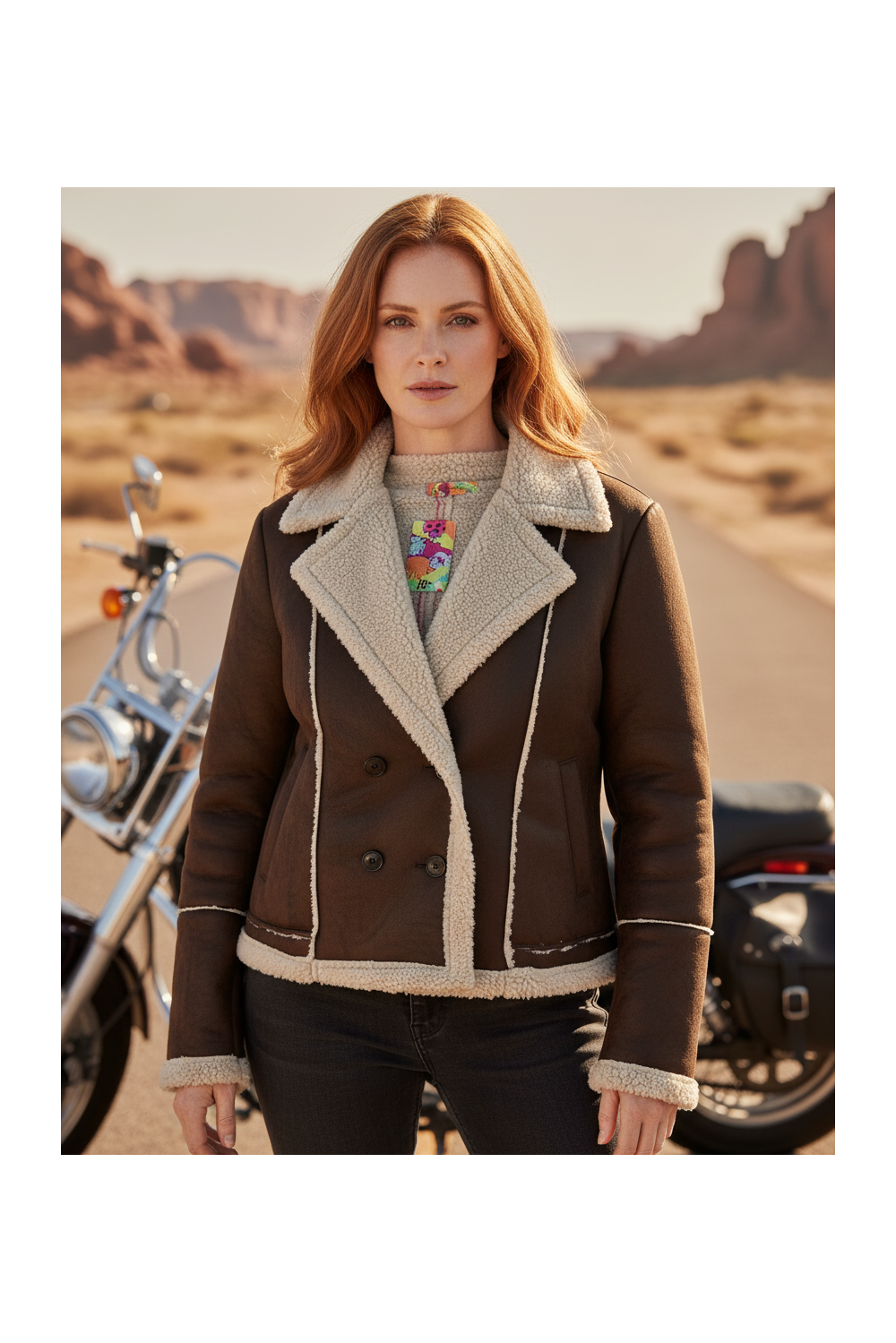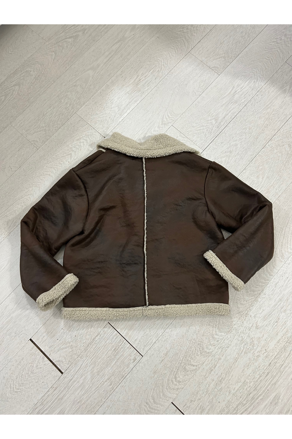 Chaqueta polipiel marrón con borreguillo. Cierre con doble botonadura y bolsillos laterales.