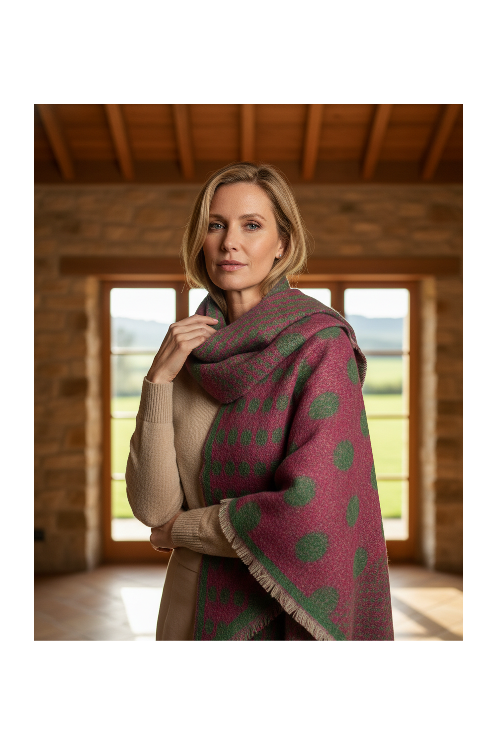 Bufanda bicolor en tonos verdes y fucsias con flecos.