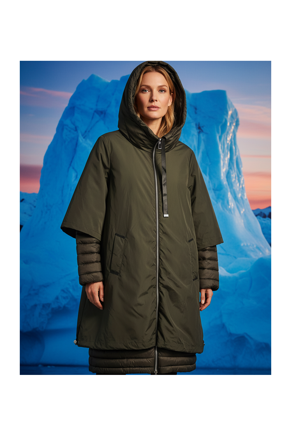 Anorak acolchado kaki con capucha.