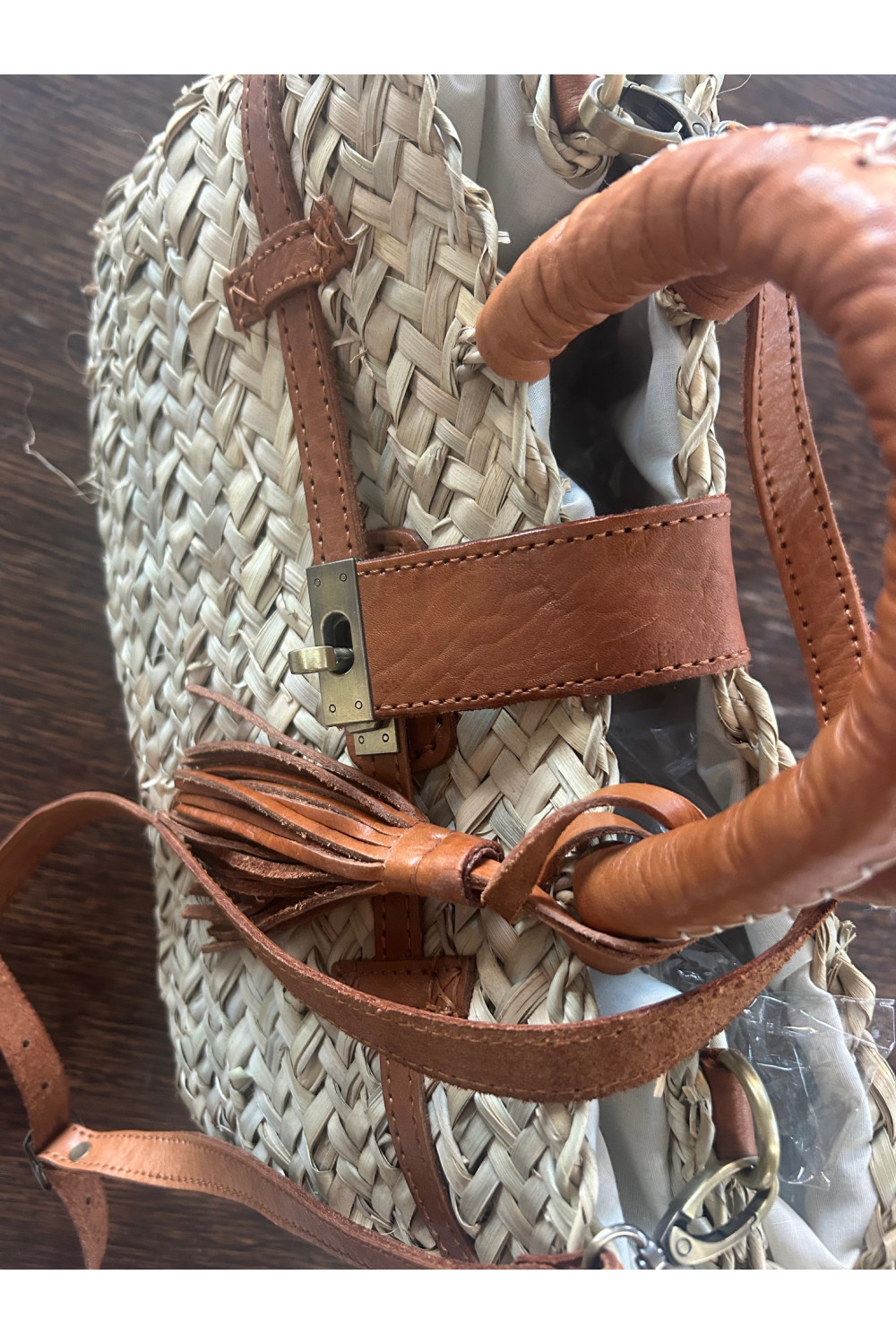 BOLSO RAFIA Y PIEL. ASA LARGA DE PIEL EN EL INTERIOR. FORRO DE TELA PARA CERRAR EL INTERIOR.
