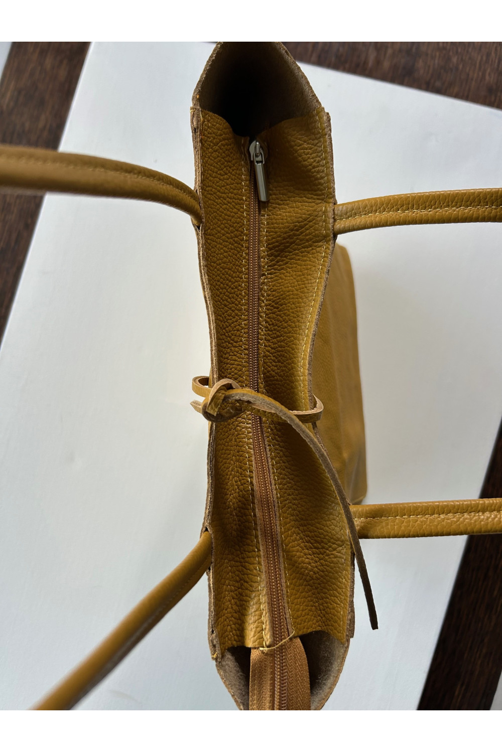 Bolso piel amarillo con cremallera y cierre con cordón. Bolsillo interior.