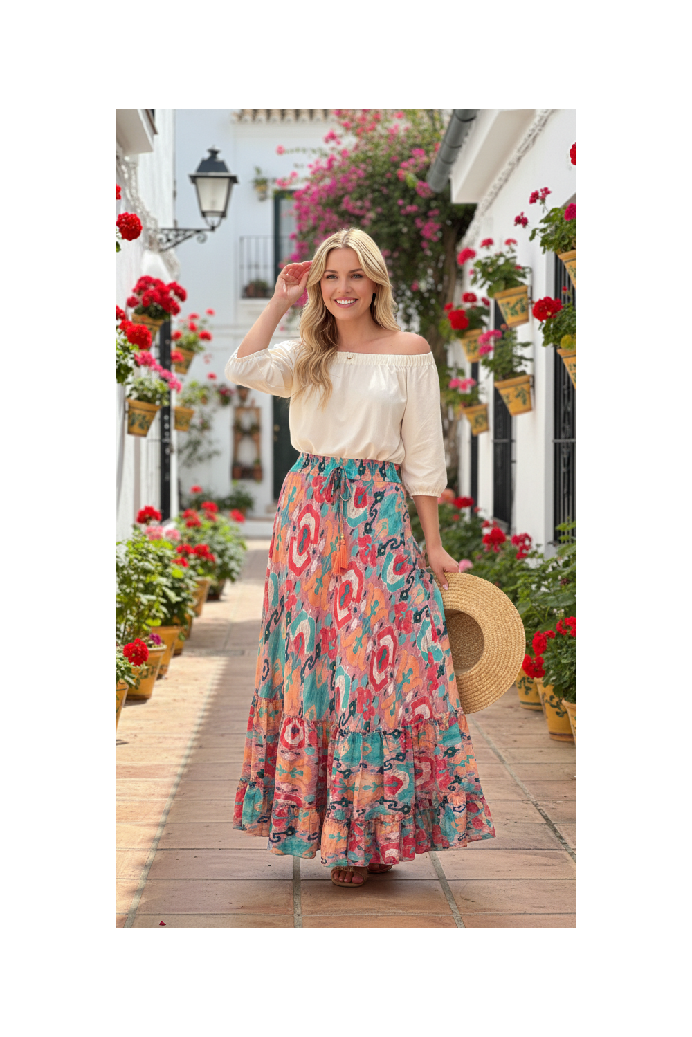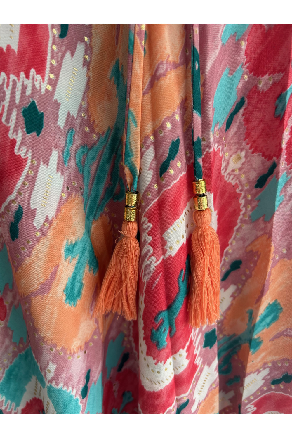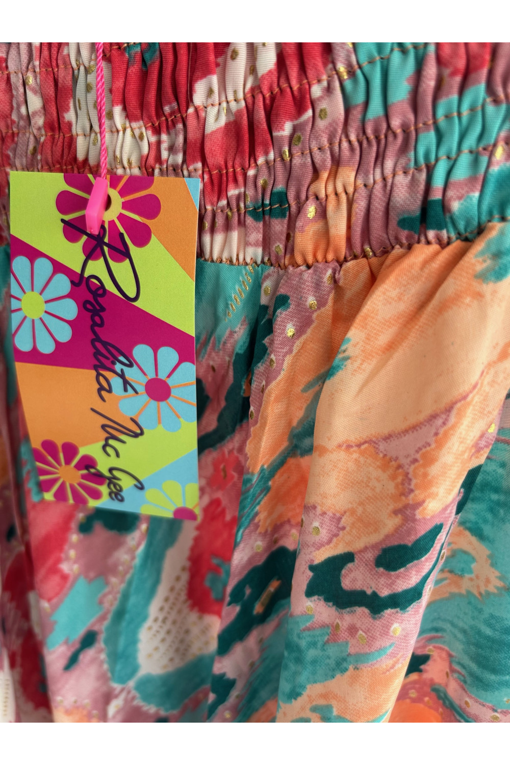 Rosalita McGee Vestido Ayr Vestido sin mangas evasé con cuello redondo y estampado figurativo en morado azul y coral entallado en la espalda con pinzas, cremallera invisible en la espalda Vista XS S M L XL