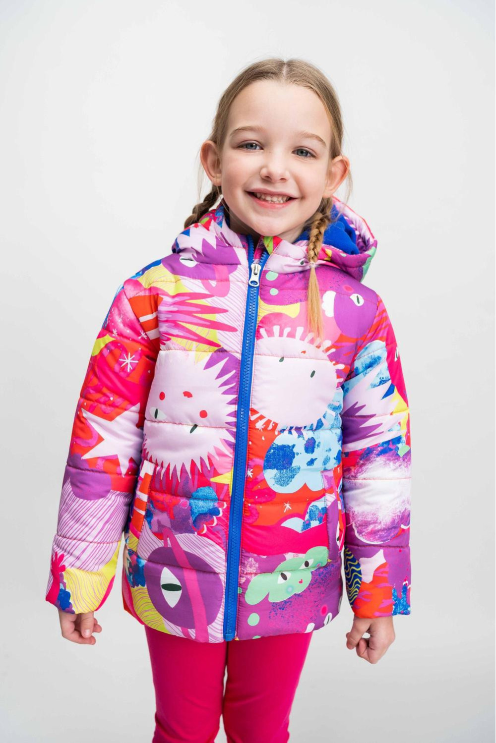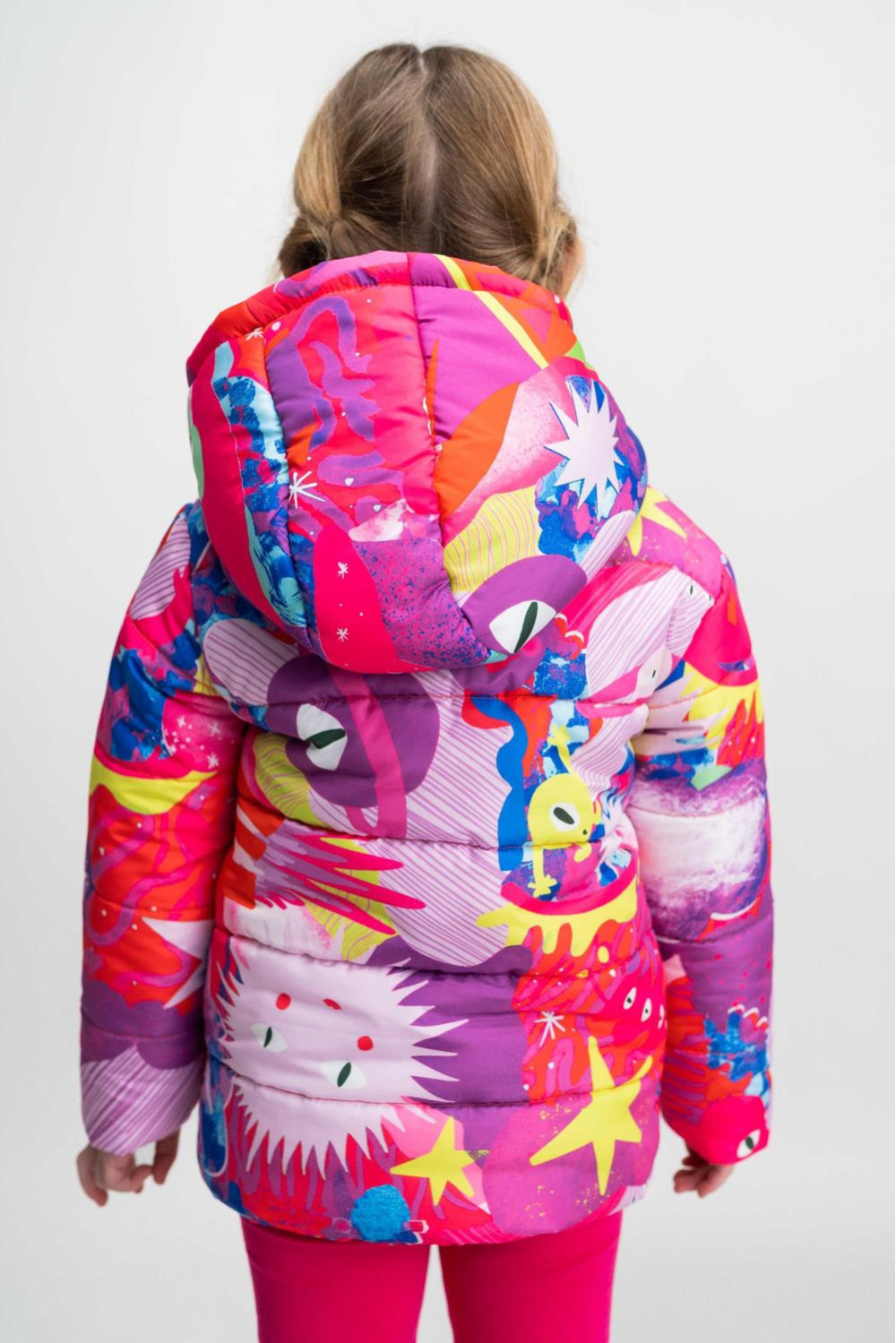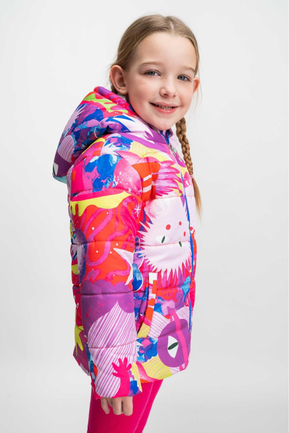 Anorak de manga larga, guateado y con capucha con estampado gráfico multicolor, cremallera y forro en polar fucsia