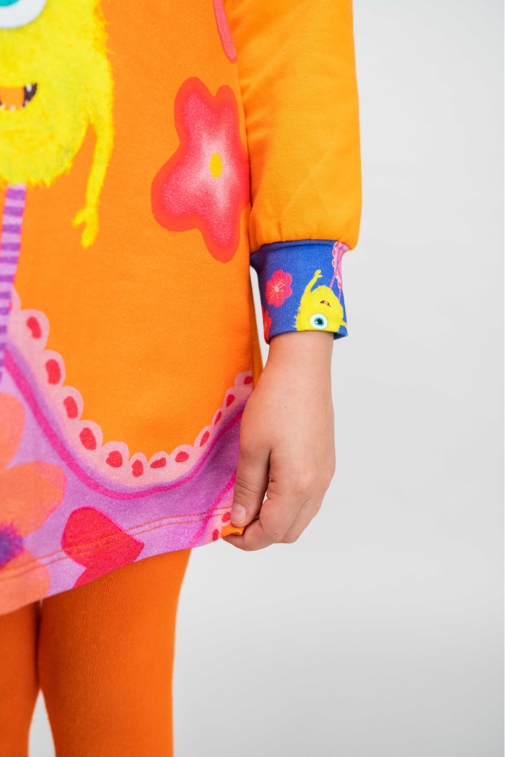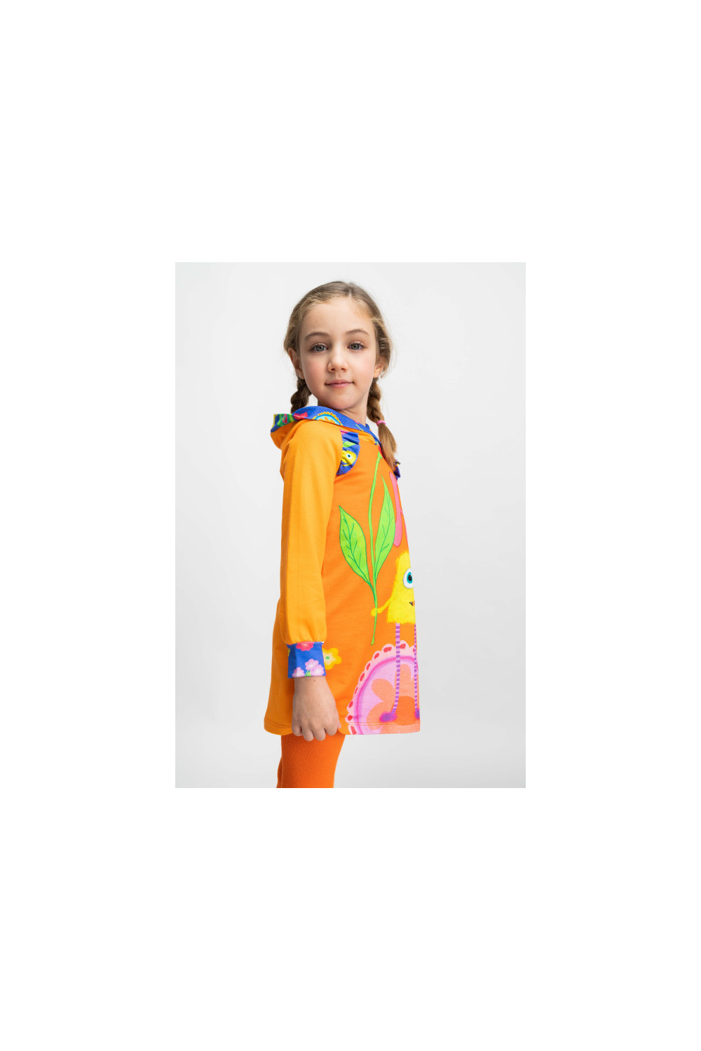 Vestido tipo sudadera larga estampada en color naranja, con capucha y detalles de volantes