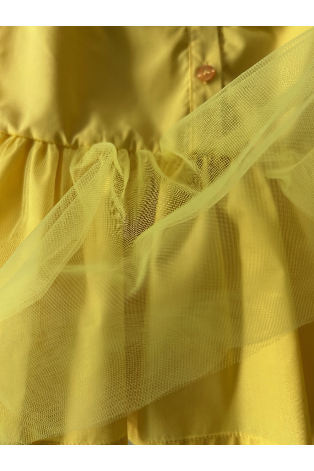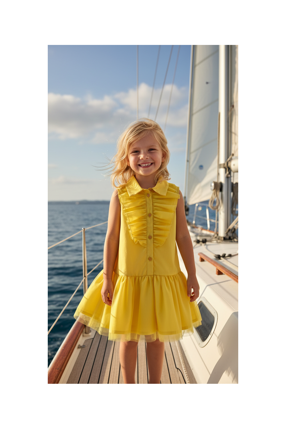 Vestido camisero sin mangas con botonadura en el delantero y volantes con tul.