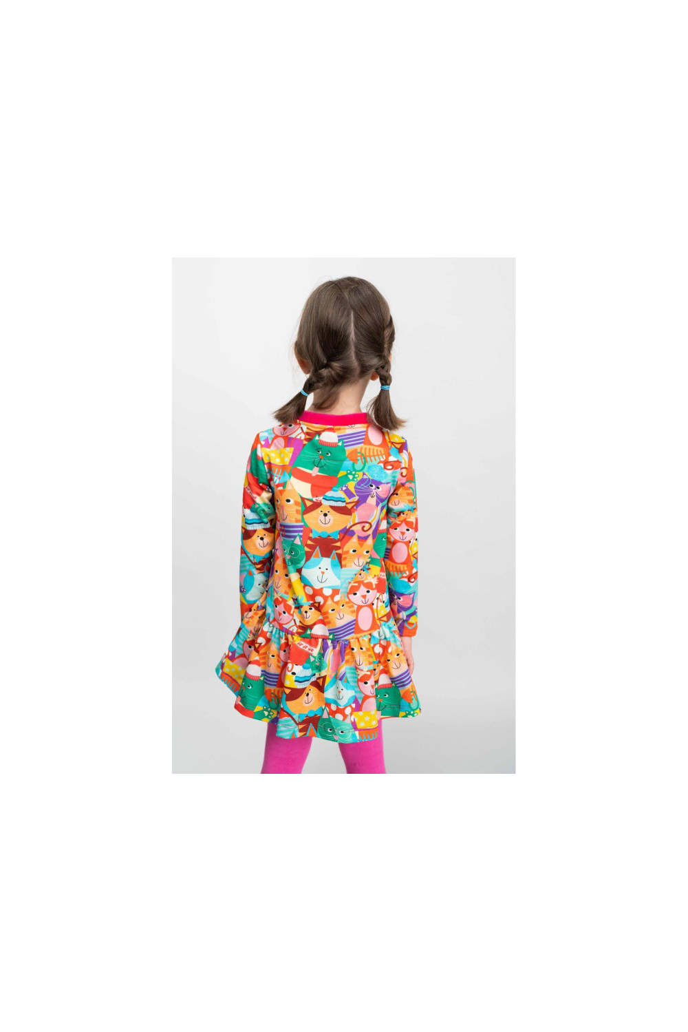 Vestido de manga larga y cuello redondo fucsia corte en la cadera asimétrico y falda fruncida de punto camiseta estampado de gatos multicolor detalle de flor de fieltro en rosa cosida en la parte superior izquierda del cuerpo