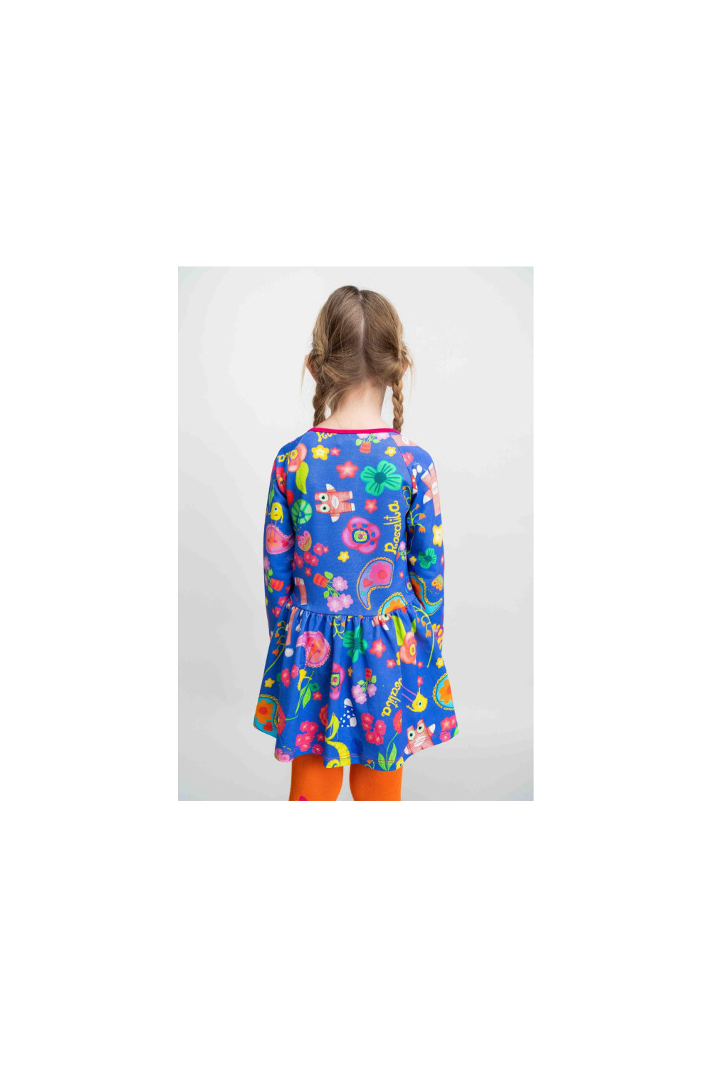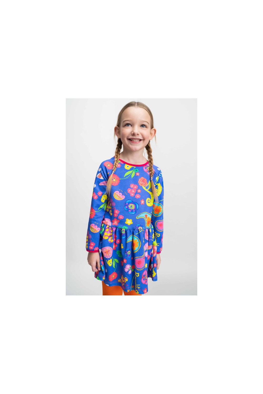 Vestido de manga larga ranglán, corte en cadera, cuello redondo y puños con bies fucsia de felpa con estampado de flores y monstruos sobre fondo azul