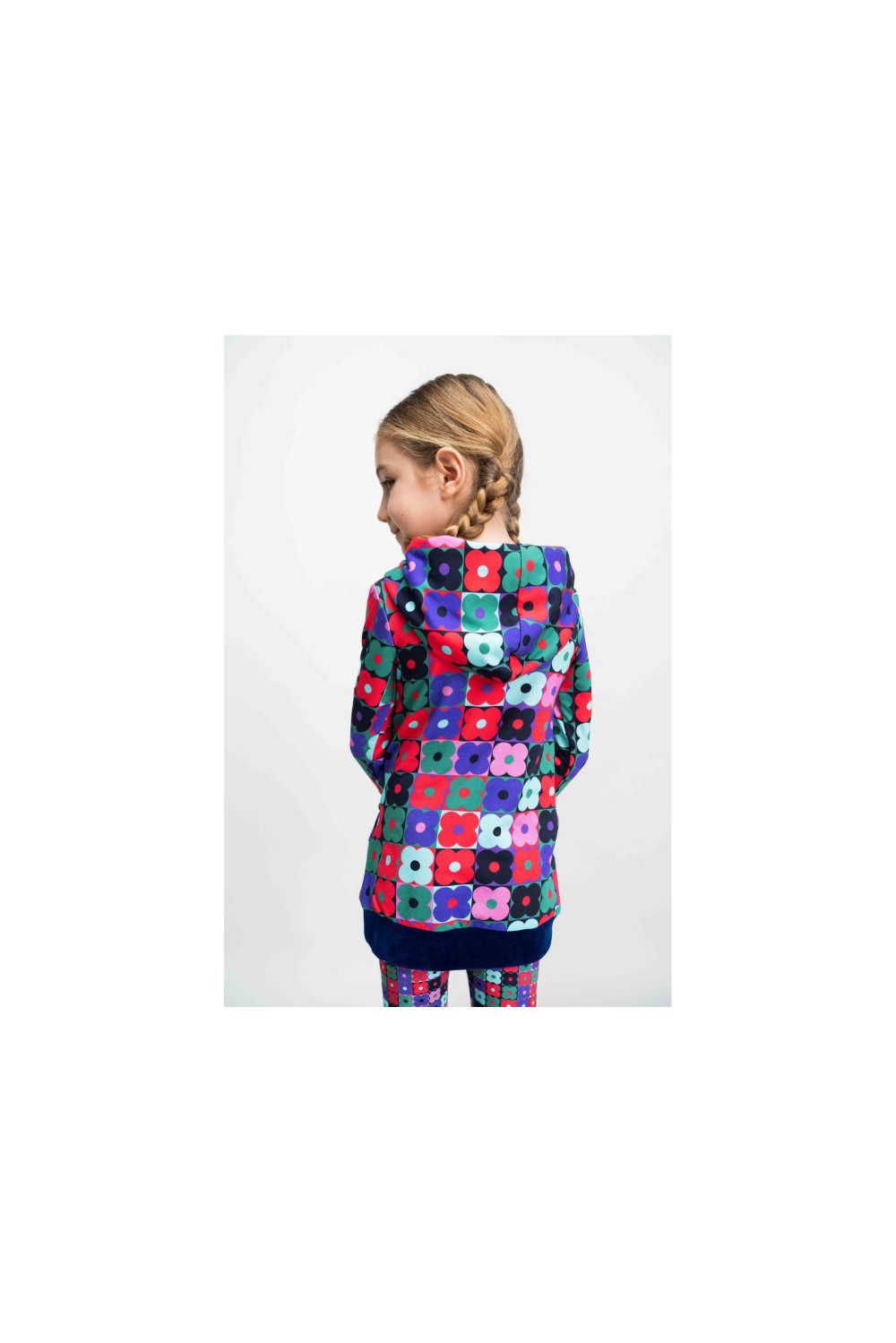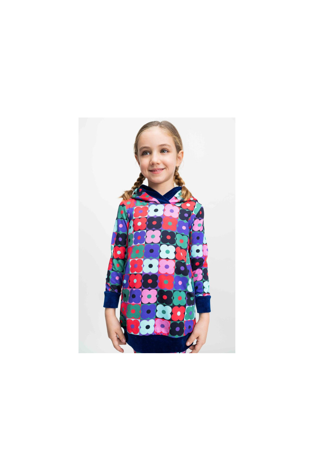Vestido-sudadera evasé de manga larga y con capucha de felpa con estampado floral multicolor y felpa marino en puños, contorno de capucha e interior, bolsillos y bajo