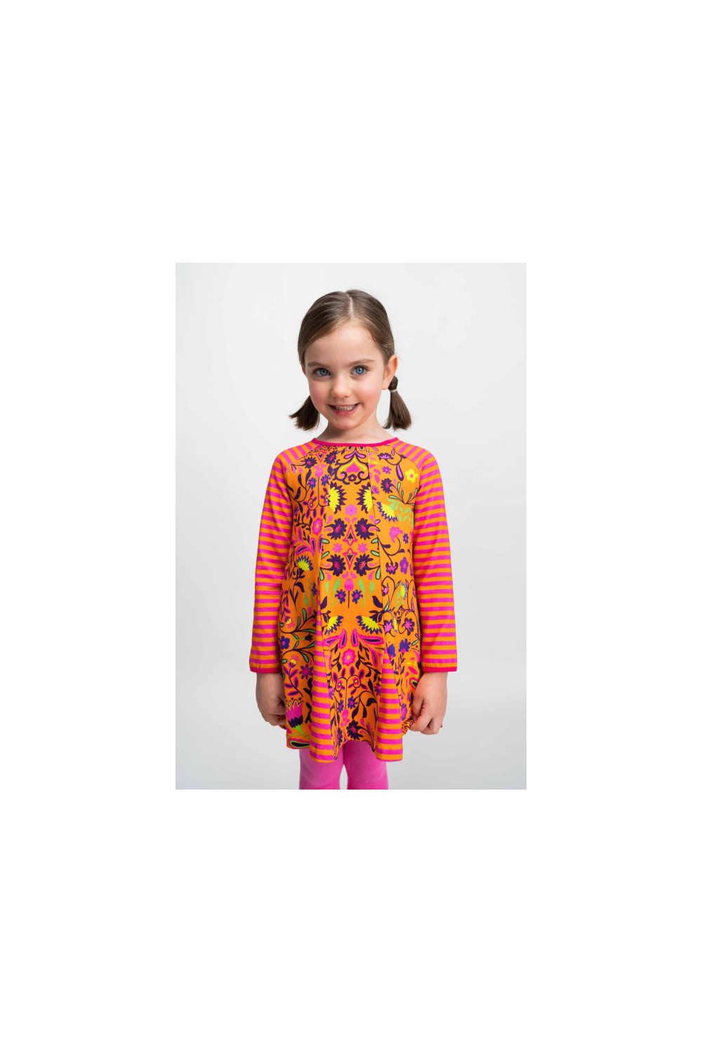 Vestido de manga larga ranglán, cuello redondo y puños con bies fucsia de felpa con cortes asimétricos mezclando rayas con estampado floral multicolor sobre fondo naranja