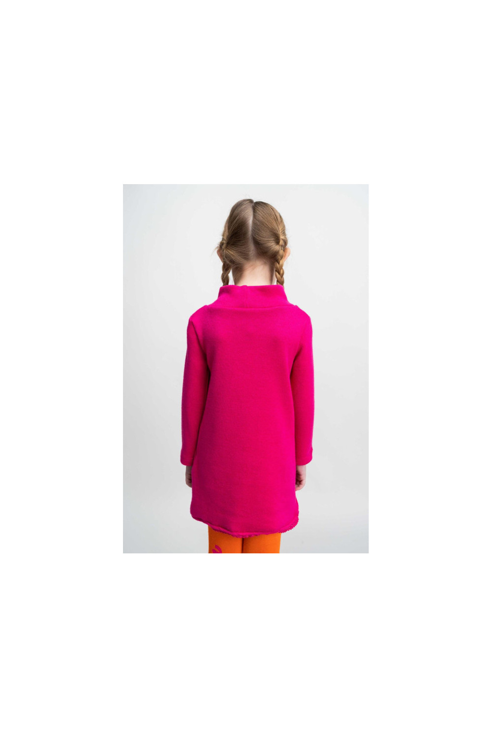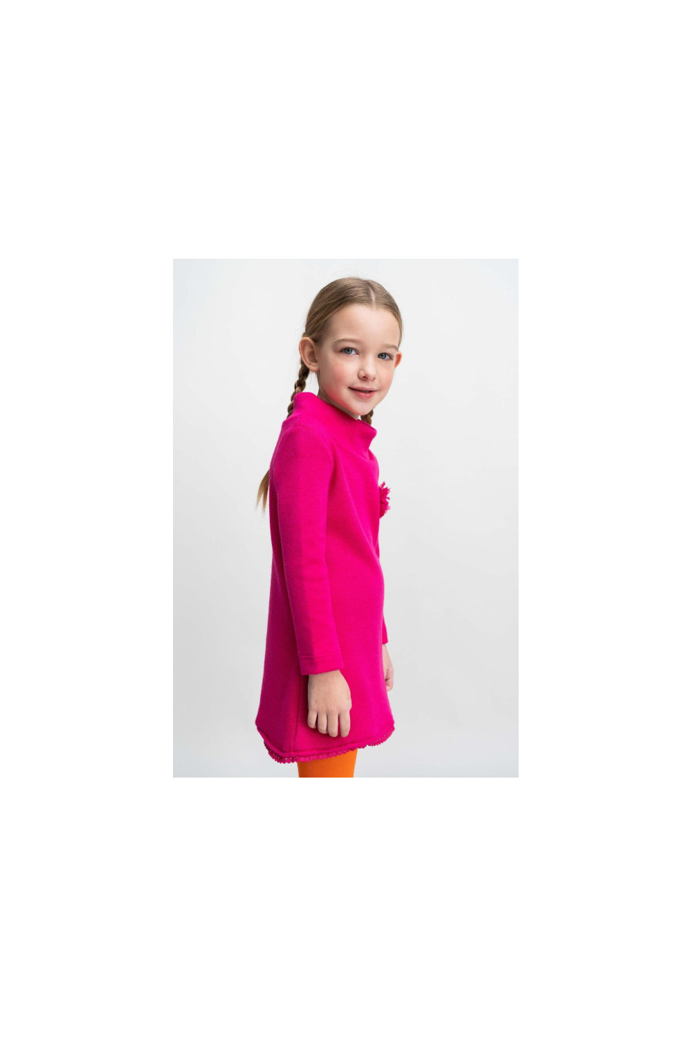 Vestido evasé de manga larga en tricot grueso fucsia con cuello cisne amplio, parche de flor y puntilla en el bajo
