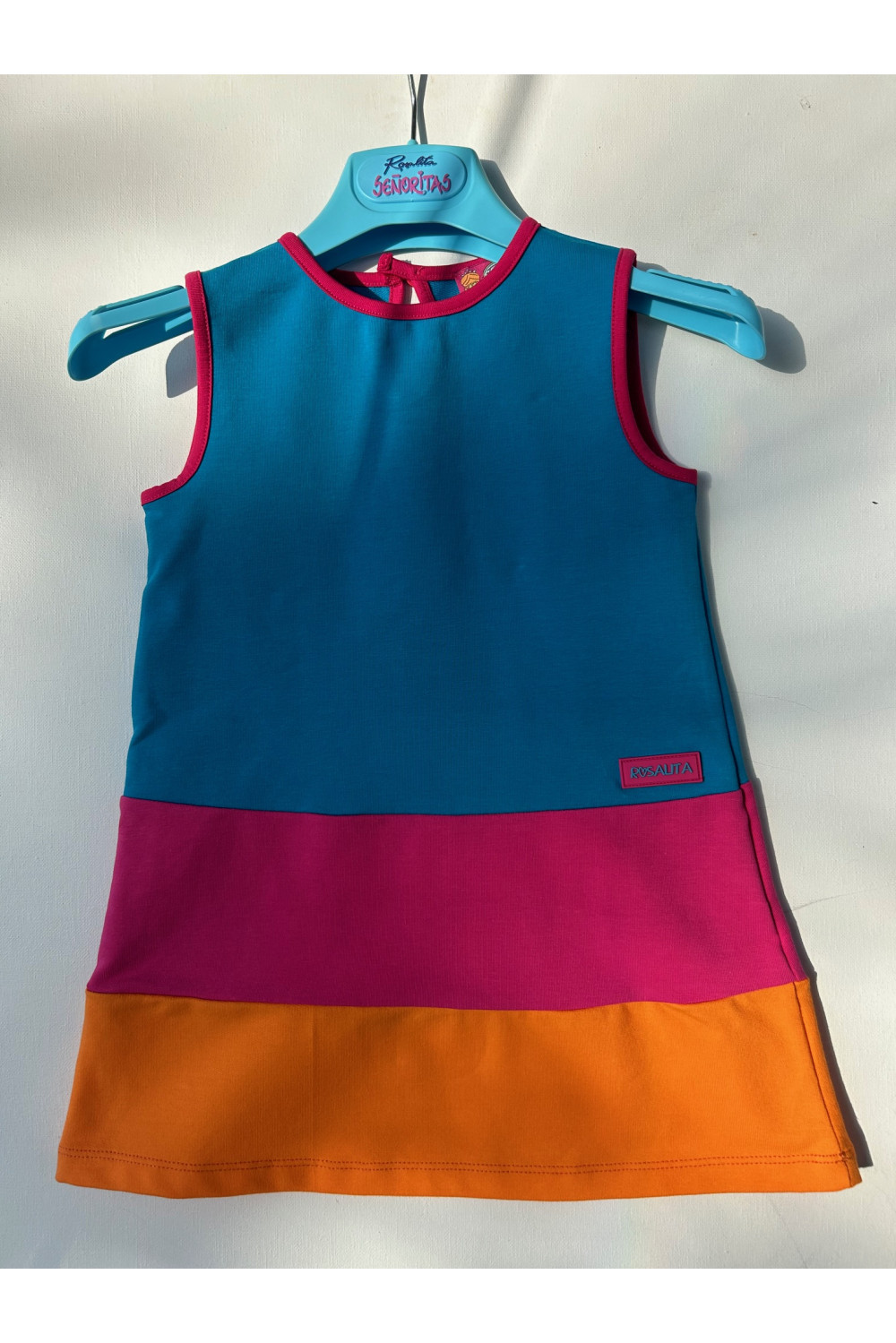 Vestido tricolor. Cierre con botón en la espalda y bies fucsia.