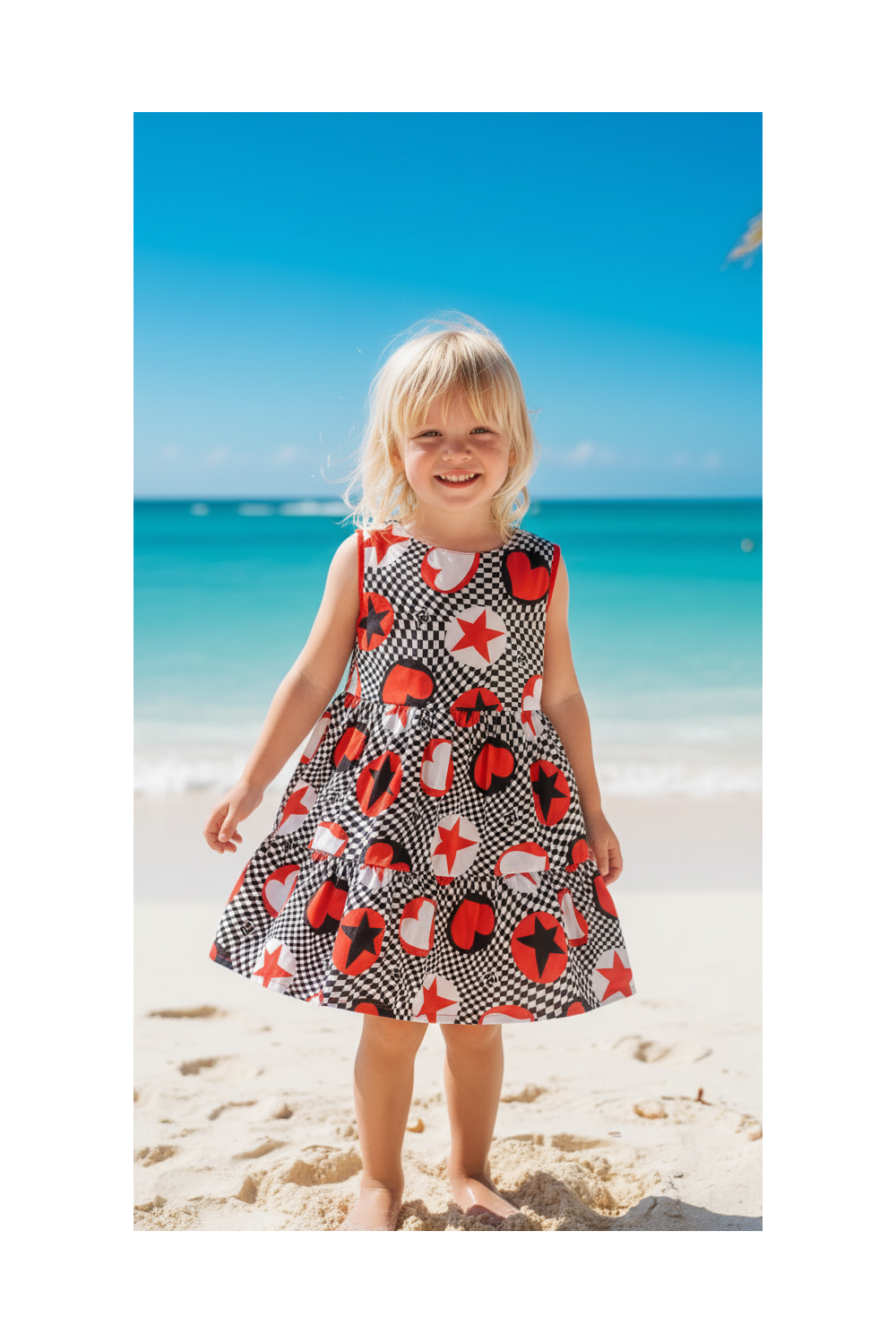 Vestido estampado de corazones, sin mangas y con cuello redondo. Cierre con cremallera invisible en la espalda.