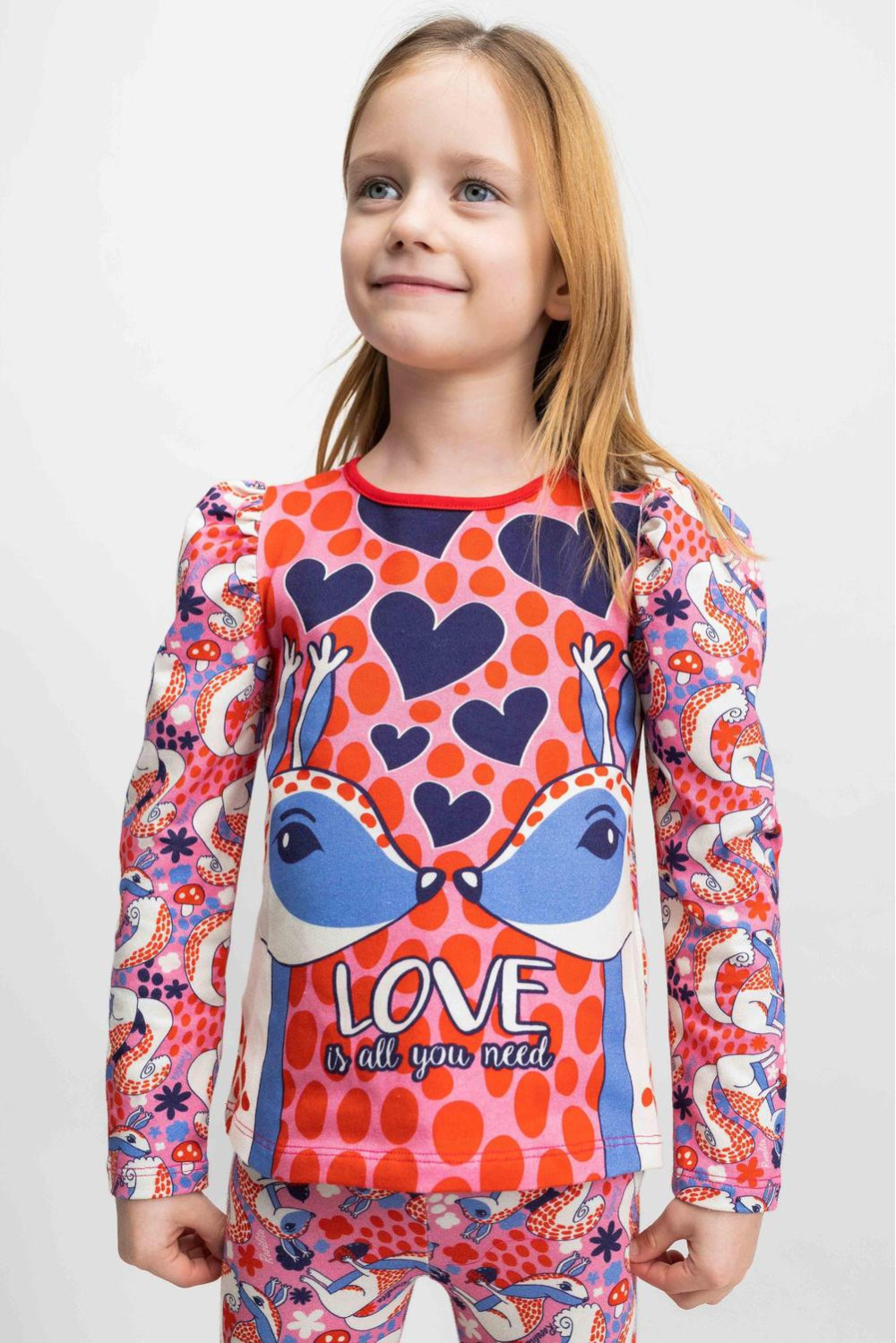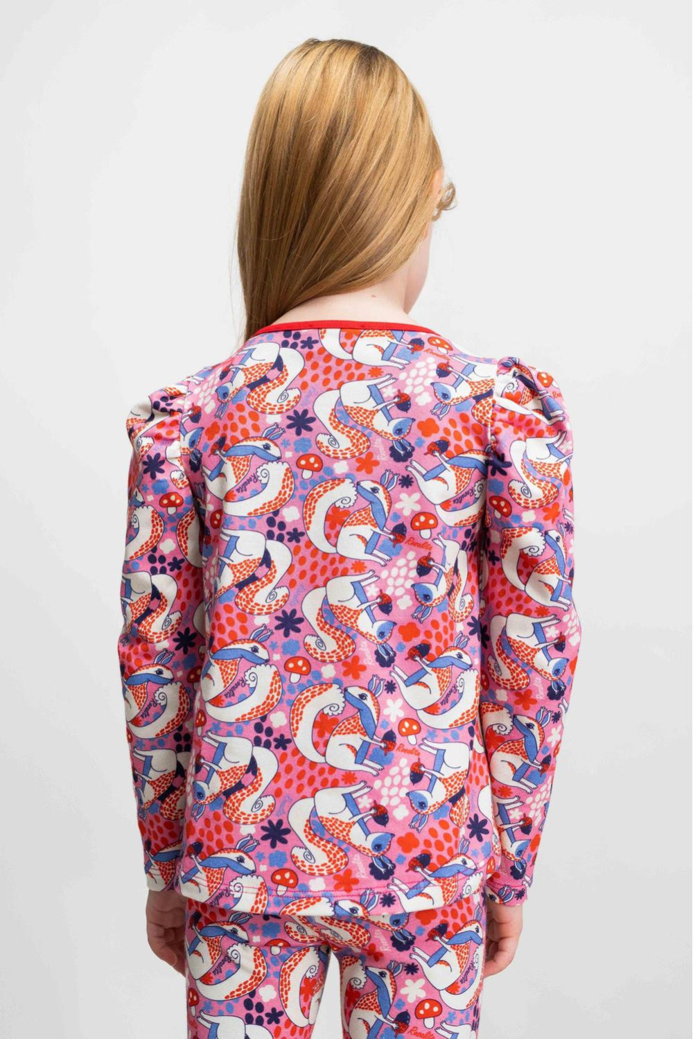 Túnica de manga larga abullonada, cuello redondo con bies en rojo de punto camiseta con estampado de ardillas, corazones y otros elementos multicolor sobre fondo rosa