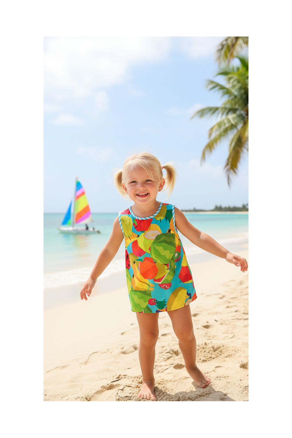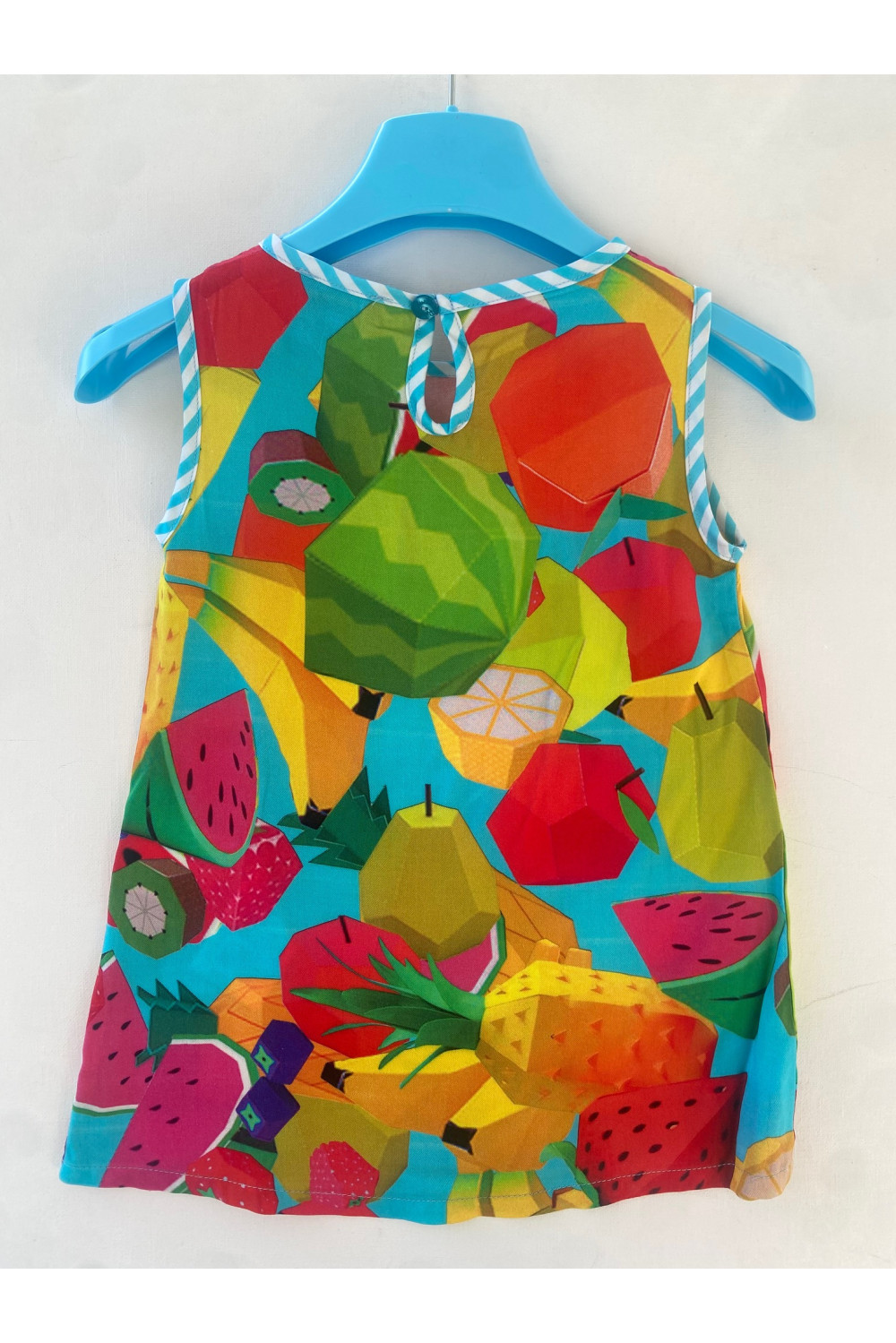 Top estampado multicolor con vivo en rayas azul celeste y blanco. Cierre con botón en la espalda.